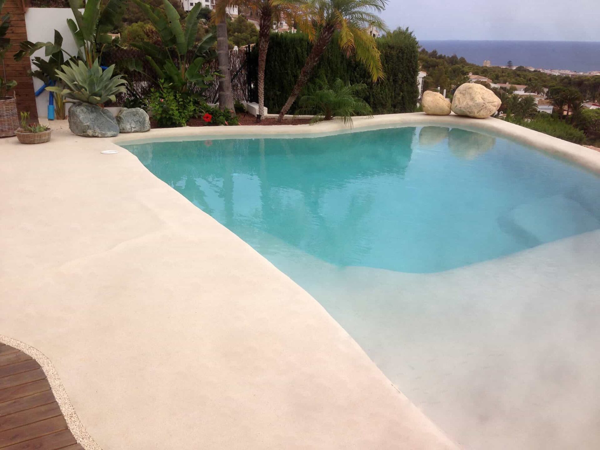 En FORMA MINERAL aplicamos el sistema SANDPOOL, un revestimiento continuo formulado con resinas epoxi técnicas y áridos seleccionados, diseñado específicamente para el vaso de la piscina. El resultado es una superficie sin juntas, de tacto suave, con estética natural tipo playa, perfectamente integrada con el entorno exterior.